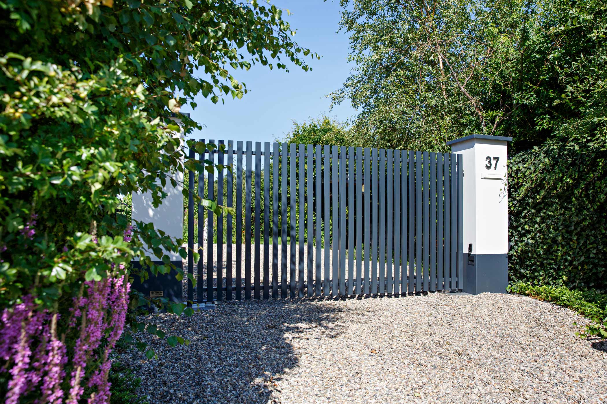 Er is gekozen voor een dubbele draaipoort tussen stalen kolommen, waardoor een ruime doorgang ontstaat voor voertuigen, terwijl het geheel een strak en symmetrisch beeld behoudt.